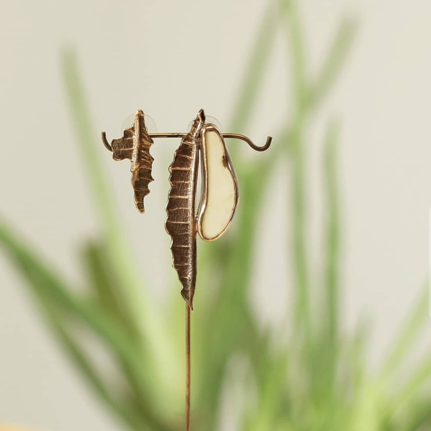 *Denizlerin bizlere hediyesi olan taş ve porselen parçalarını kullanarak oluşturduğumuz "Recycled Koleksiyon" ürünü "Beyaz Taşlı Yaprak Küpe" bronz metal kullanılarak elde üretilmiştir.