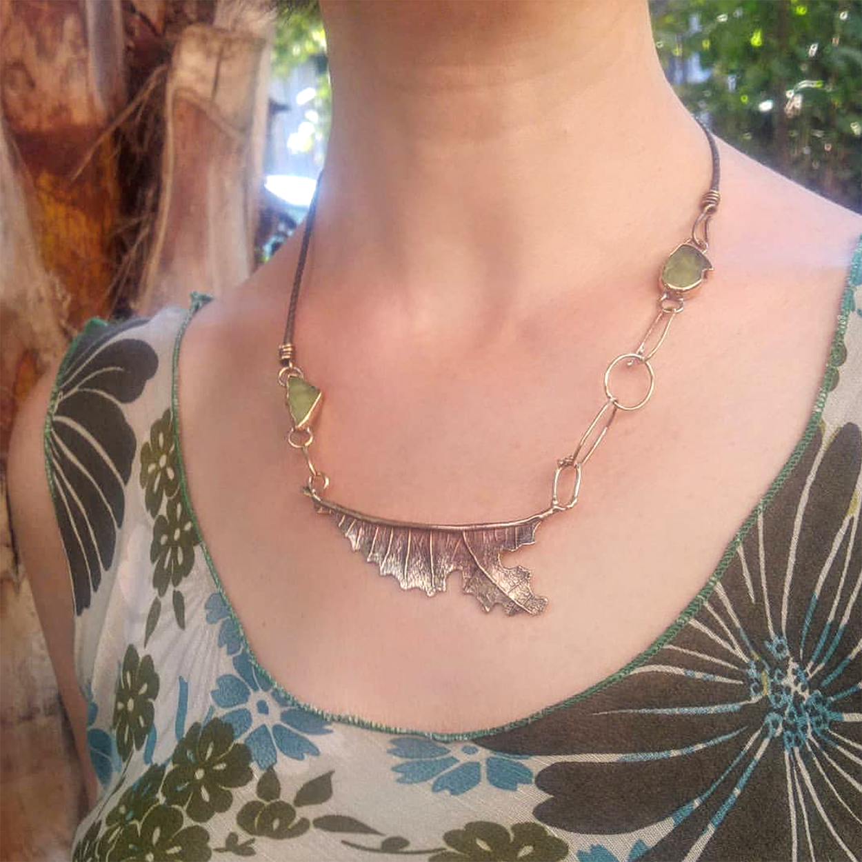 Çift Yeşil Camlı Bronz Yaprak Kolye