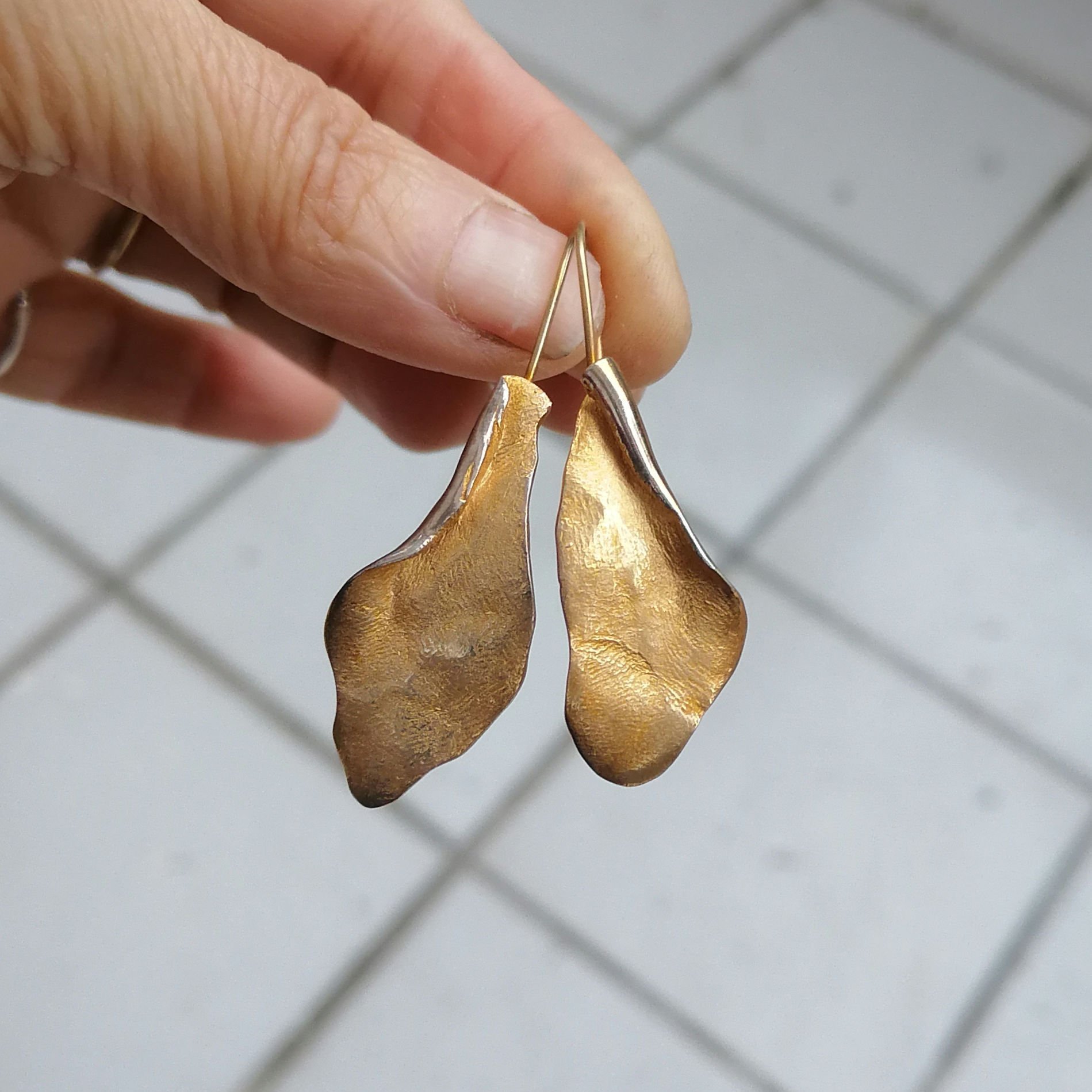 Sıradan çizgilerin dışına çıkan bu küpeler, ışığı her açıda farklı yansıtan ham yüzeyiyle hem karakterli hem de zarif bir duruş sergiliyor. Tasarımındaki organik kavisler, yüzünüzün hatlarını yumuşatırken altın kaplamanın sıcak ışıltısı her anınıza eşlik ediyor.