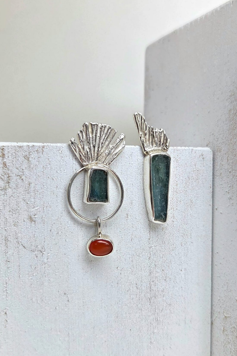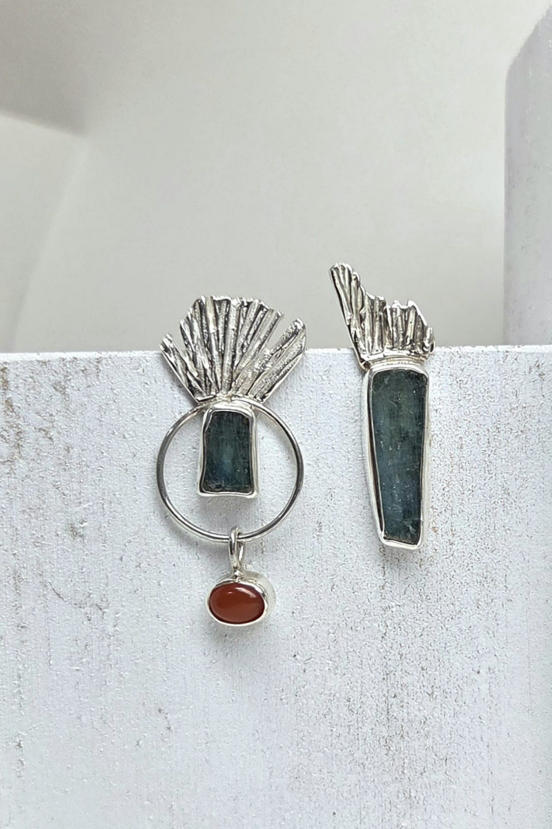 Asimetrik Tasarım: Bir adet yelpaze formunda sallantılı ve bir adet yalın bar formunda tasarlanan bu Kyanit ve Carnelian Yelpaze Gümüş Küpe, modern ve bohem bir duruş sergiler.