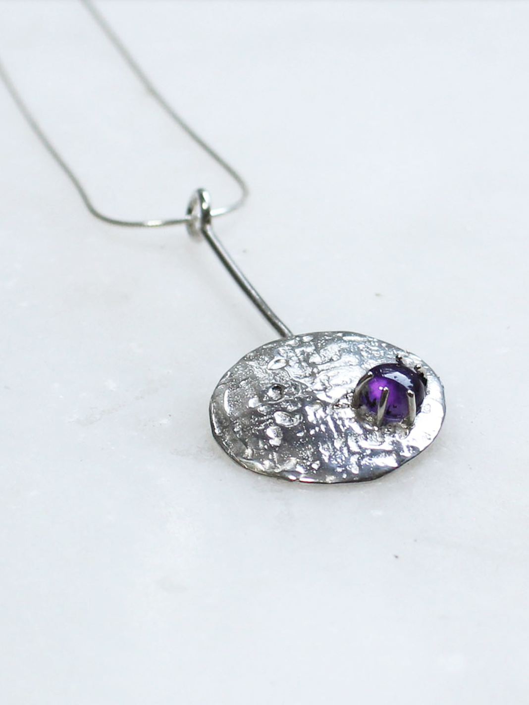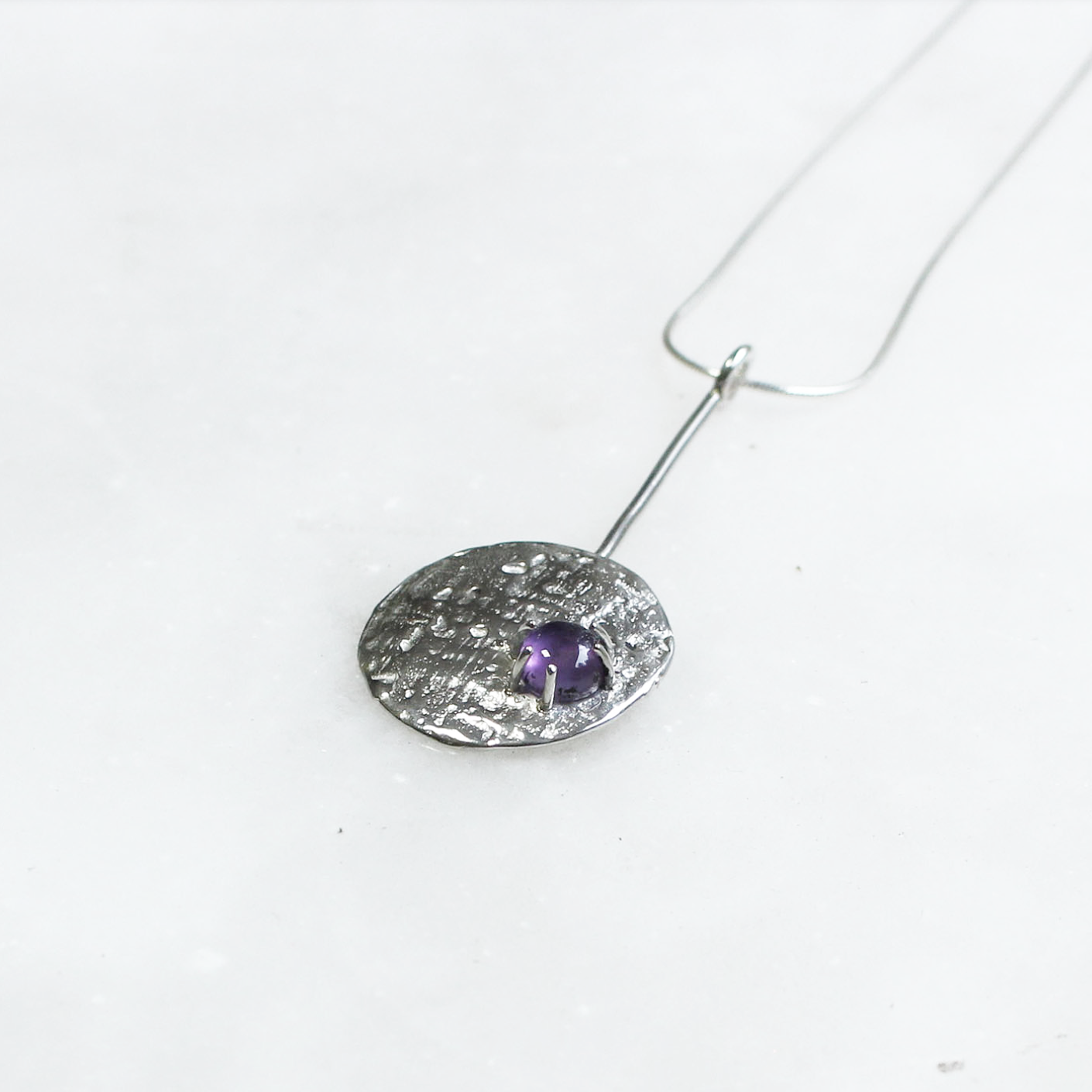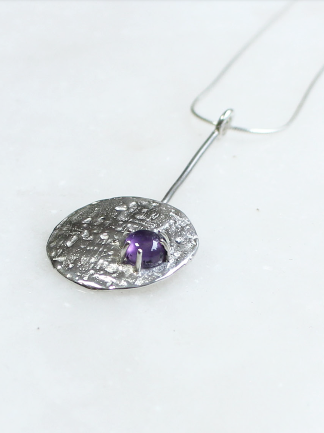 Tasarım: Ametist Taşlı Krater Kolye, el işçiliği ile oluşturulmuş karakteristik bir yüzeye sahiptir