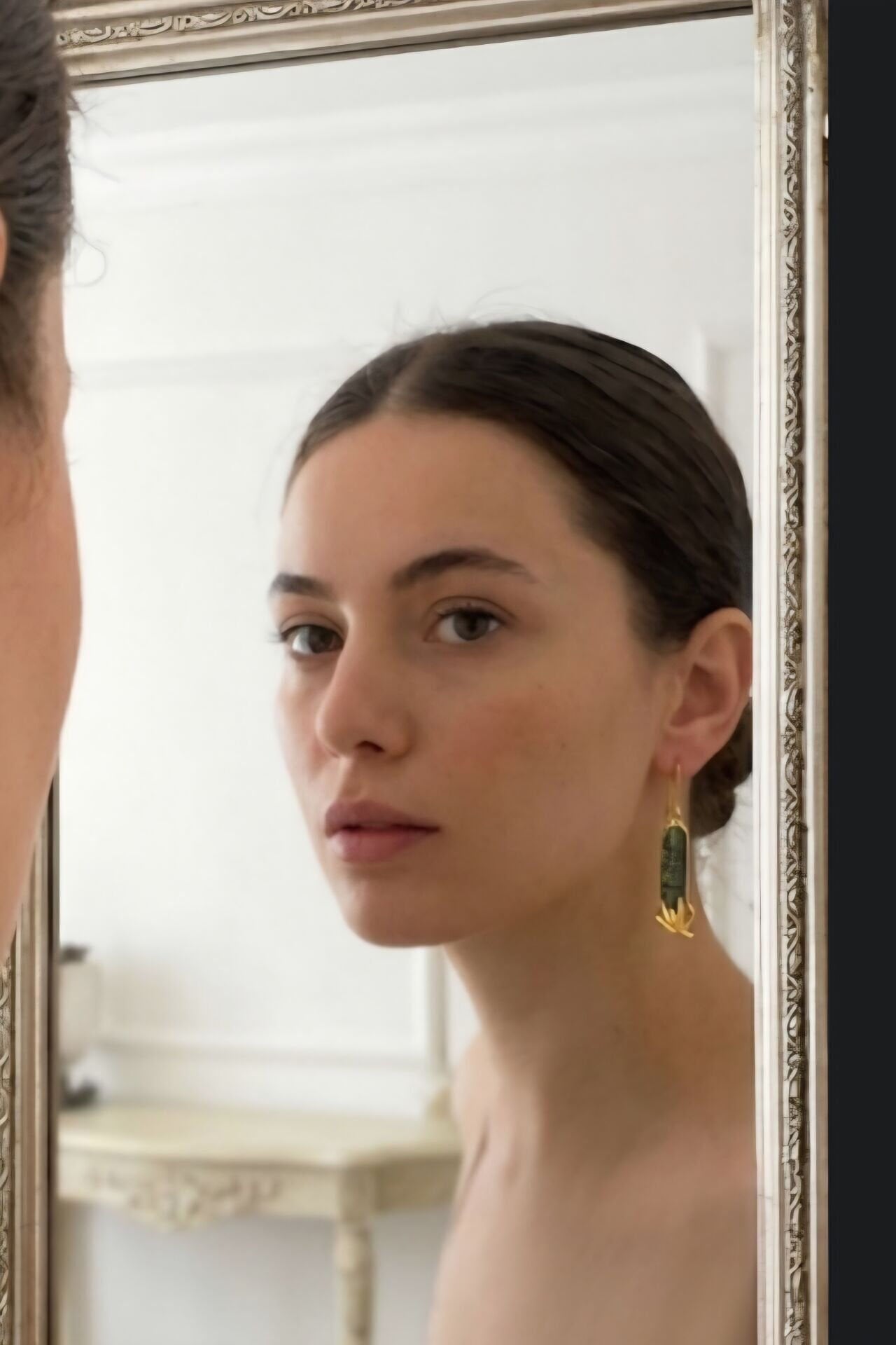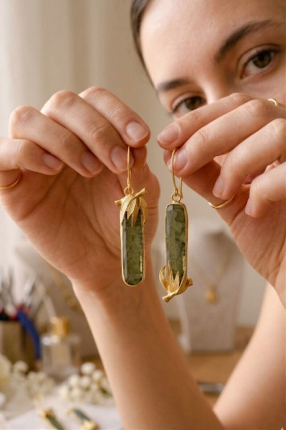 925 ayar gümüş üzerine altın kaplamanın sıcaklığı, Bambu Detaylı Kyanite Taşlı Küpe modeline rustik ama modern bir karakter katıyor. Kyanite taşının karakteristik çizgileri ve bambu dallarının esnekliği, zanaatın fabrikasyona karşı duran samimi dilini yansıtır. Her biri elde hazırlanan bu Bambu Detaylı Kyanite Taşlı Küpe, doğaya dönüş temasını kulaklarınıza taşıyan özgün bir tılsım gibidir.