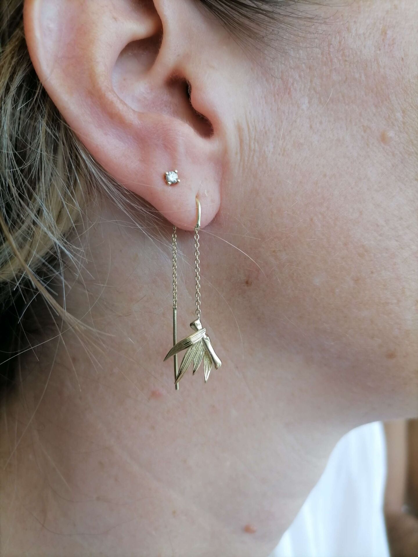 Bambu, doğada esnekliği ve gücü temsil eder. Bu el yapımı altın küpeler, hem bu güçlü anlamı taşır hem de modern "ear threader" (zincir geçirmeli) tarzıyla takı koleksiyonunuza sofistike bir dokunuş katar.