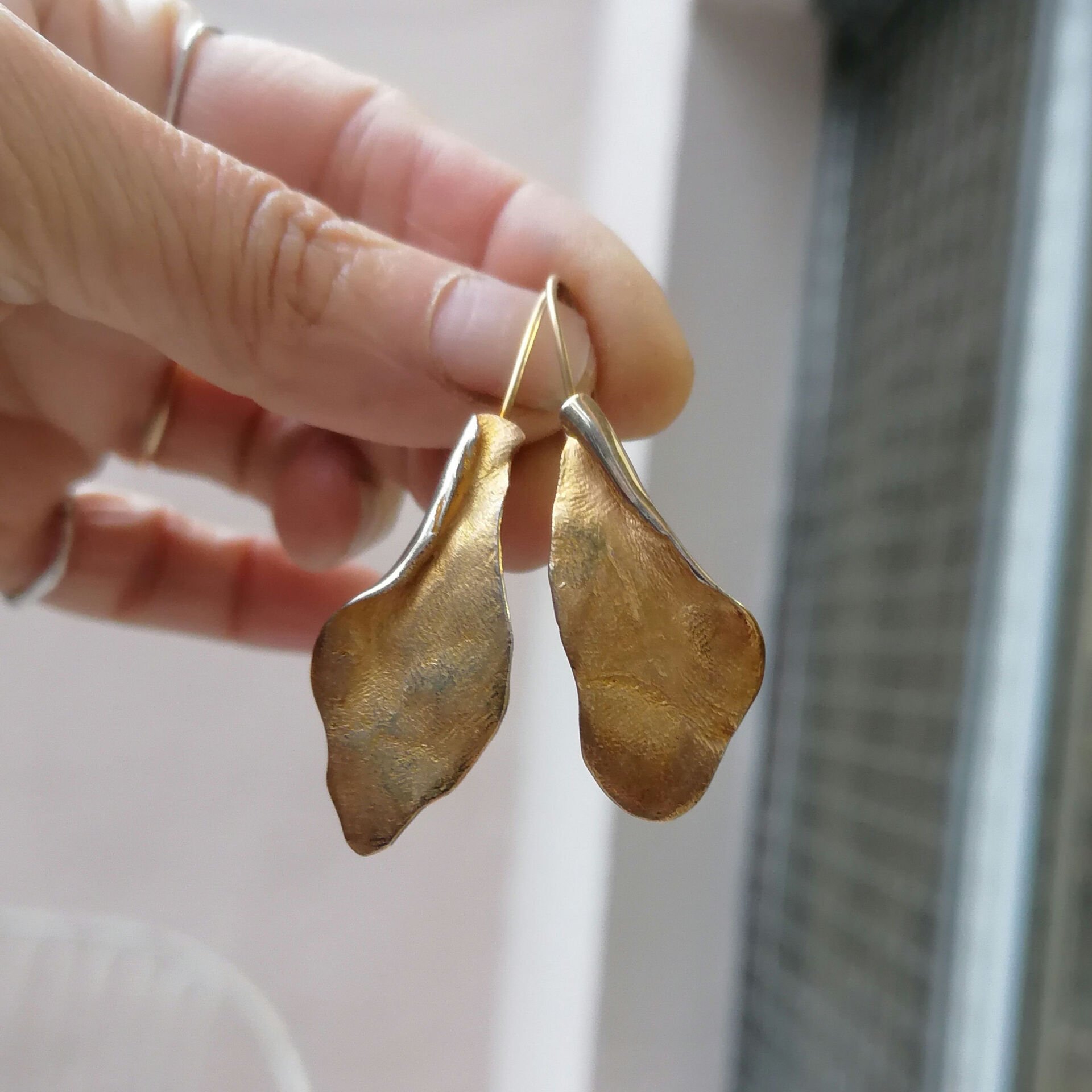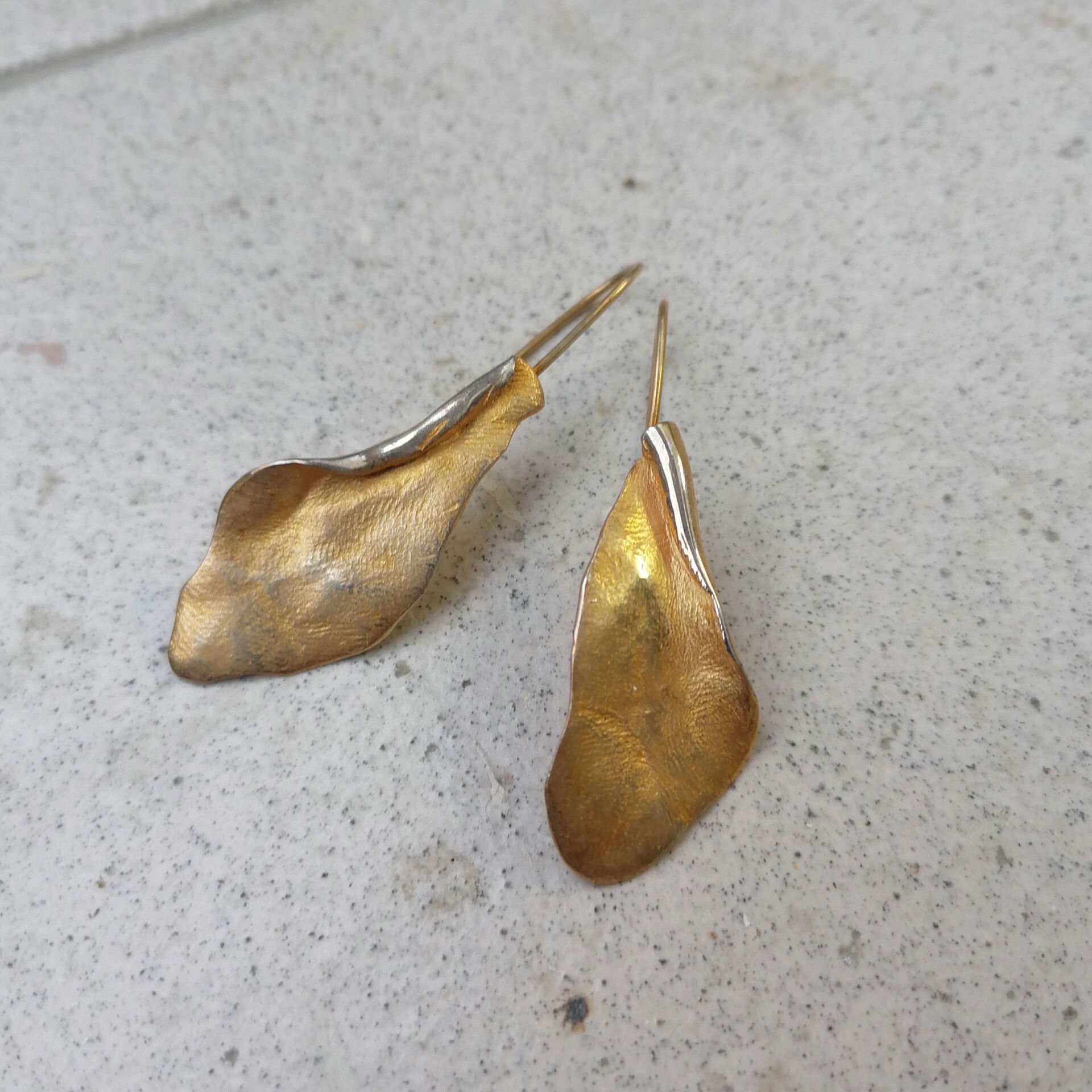 Sıradan çizgilerin dışına çıkan bu küpeler, ışığı her açıda farklı yansıtan ham yüzeyiyle hem karakterli hem de zarif bir duruş sergiliyor. Tasarımındaki organik kavisler, yüzünüzün hatlarını yumuşatırken altın kaplamanın sıcak ışıltısı her anınıza eşlik ediyor.