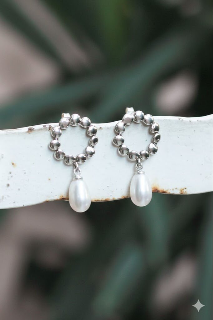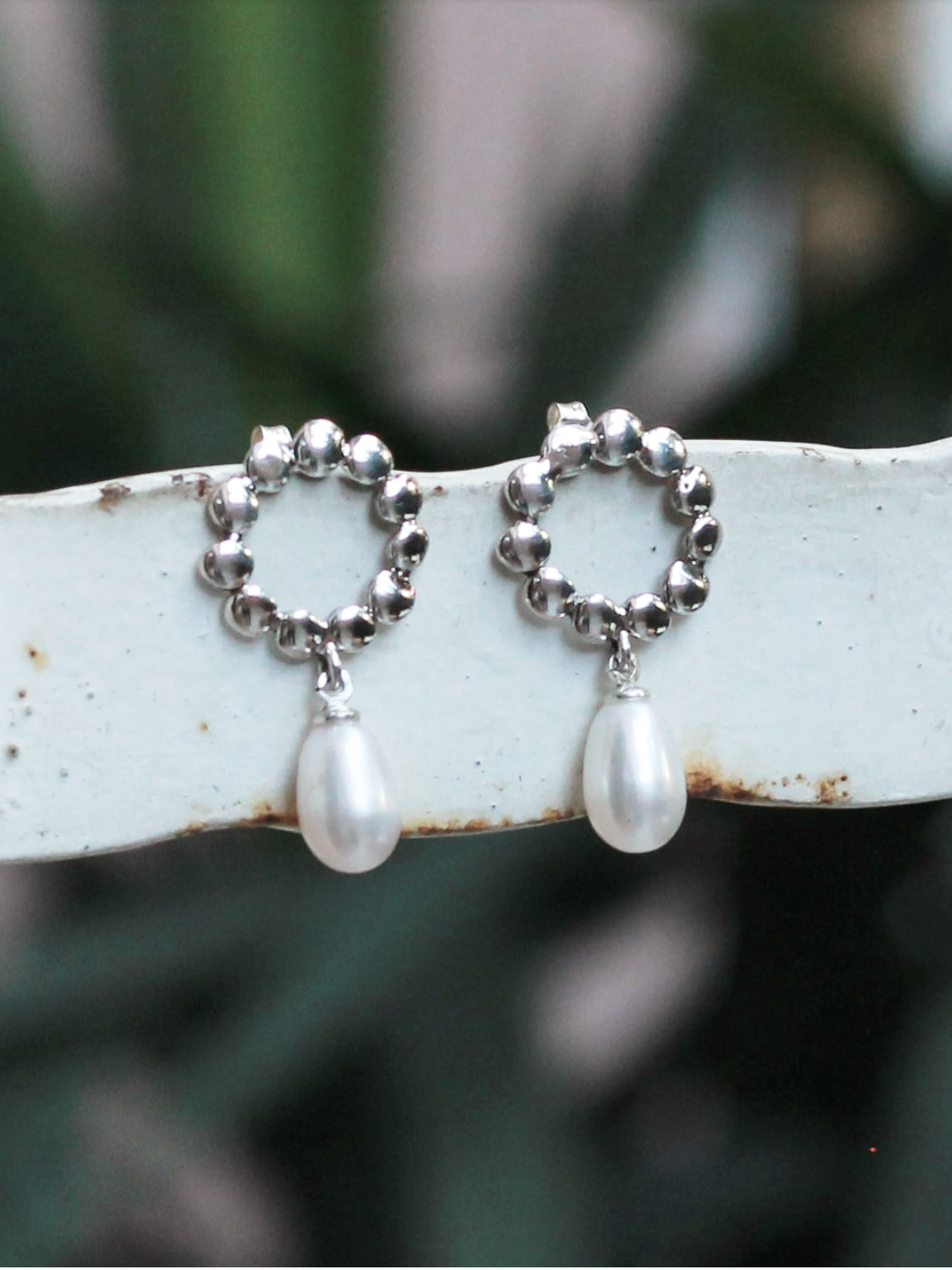 925 ayar gümüşün parlak dokusuyla çevrelenen "bubble" (baloncuk) formu, ucunda sallanan birinci sınıf damla inci ile kusursuz bir denge yakalıyor.