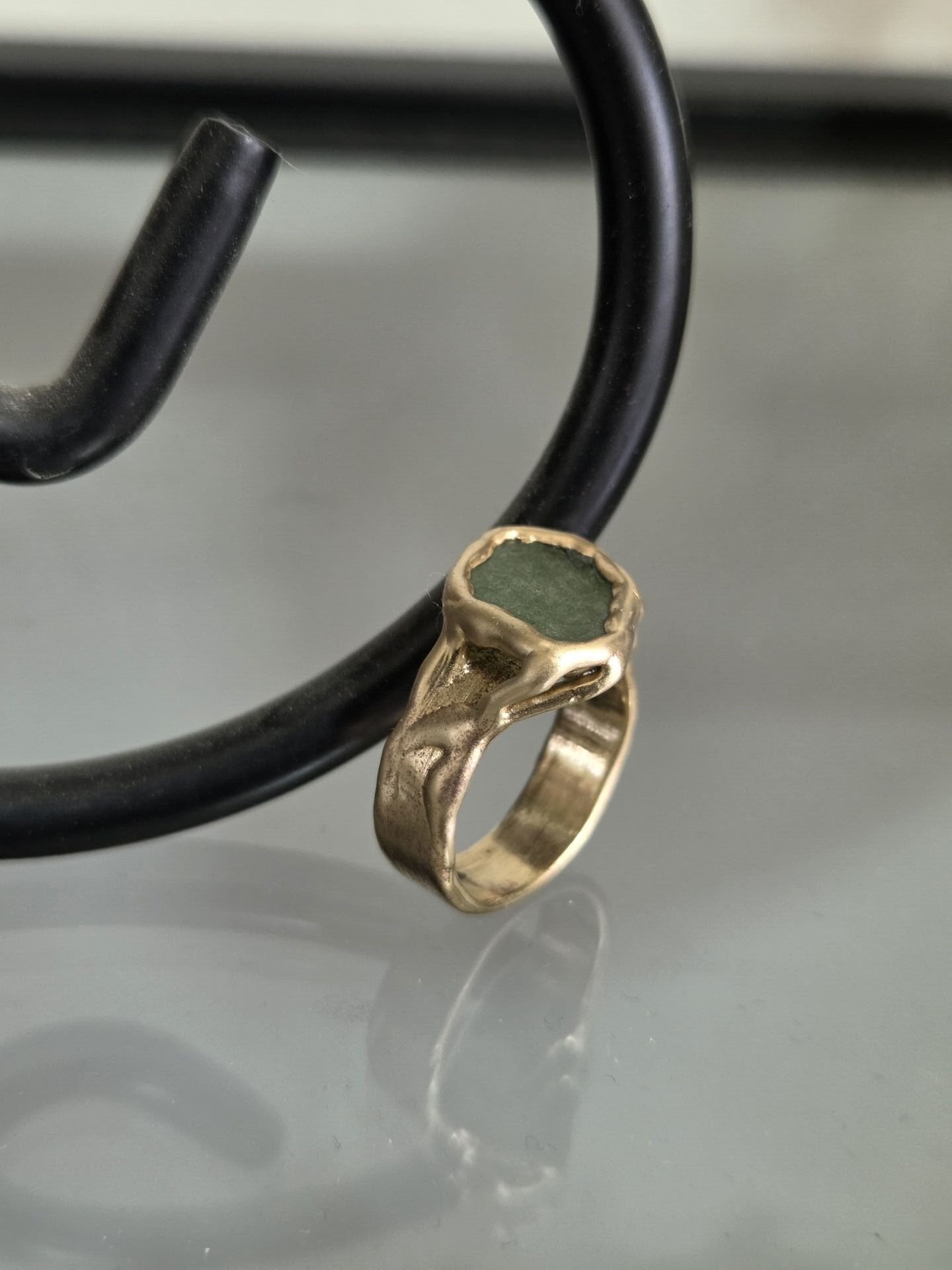 Moda’daki atölyemizde antik formlardan ilham alınarak hazırlanan bu deniz camı yüzük, parmağınızda adeta denizin kıyıya bıraktığı bir hatırayı taşıyor. Bronzun zamanla karakter kazanan yapısı, bu deniz camı yüzük modelini size yıllar boyu size eşlik edecek bir hikâyeye dönüştürüyor. Modern ve yalın kombinlerinizi doğadan gelen bu güçlü parçayla tamamlamak isterseniz, bu yüzük sizin için en doğru seçim olacak.