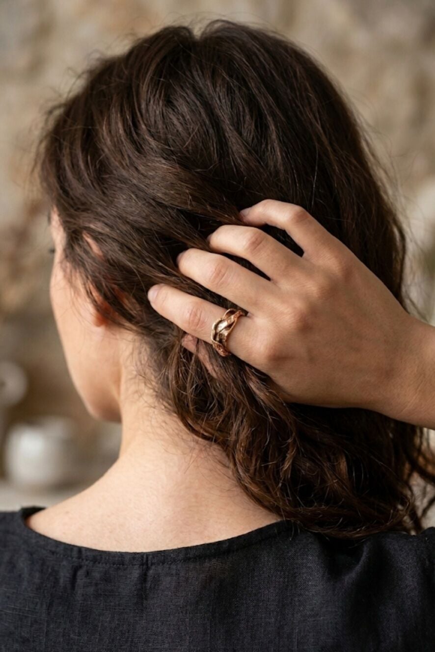 Saçlarınızın arasında parlayan antik bronz ışıltısı, günlük stilinize sofistike bir dokunuş katarken; organik kıvrımları her bakışta farklı bir detay sunuyor. İşaret parmağında güçlü bir duruş sergileyen bu tasarım, hem tek başına bir ifade biçimi hem de stilinizin vazgeçilmez bir parçası olacak.