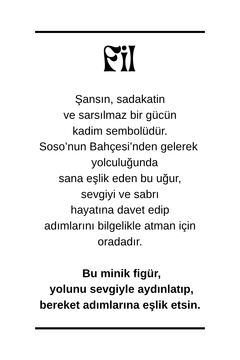 Her bir fil bileklik, seri üretimin soğukluğundan uzak, zanaatkar bir el emeğiyle üretildi. "Slow Fashion" ilkelerine sadık kalarak, sadece size özel bir enerji taşıması için hazırlanan bu fil bileklik, Soso'nun bahçesindeki uğuru bileğinize taşıyor. Ayarlanabilir zincir yapısı ve hafif dokusuyla hem çocukların hem de yetişkinlerin keyifle takabileceği bu fil bileklik, hem kendiniz hem de sevdikleriniz için narin ve anlamlı bir hediye alternatifi oluşturuyor.