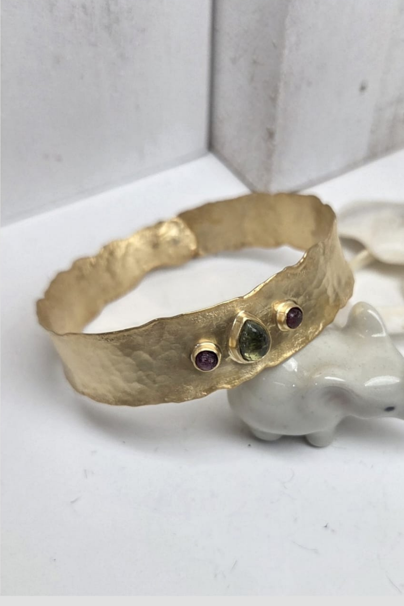 Neden Üç Turmalin Taşlı Çekiç Dövme Gümüş Bilezik? Çünkü bu tasarım, geleneksel çekiçleme teknikleri kullanılarak Moda’daki atölyemizde tamamen el işçiliğiyle şekillendirildi. Üzerindeki üç farklı tondaki turmalin taşı, gümüşün altın kaplama dokusuyla birleşerek bileğinizde adeta bir asalet simgesi gibi durur.