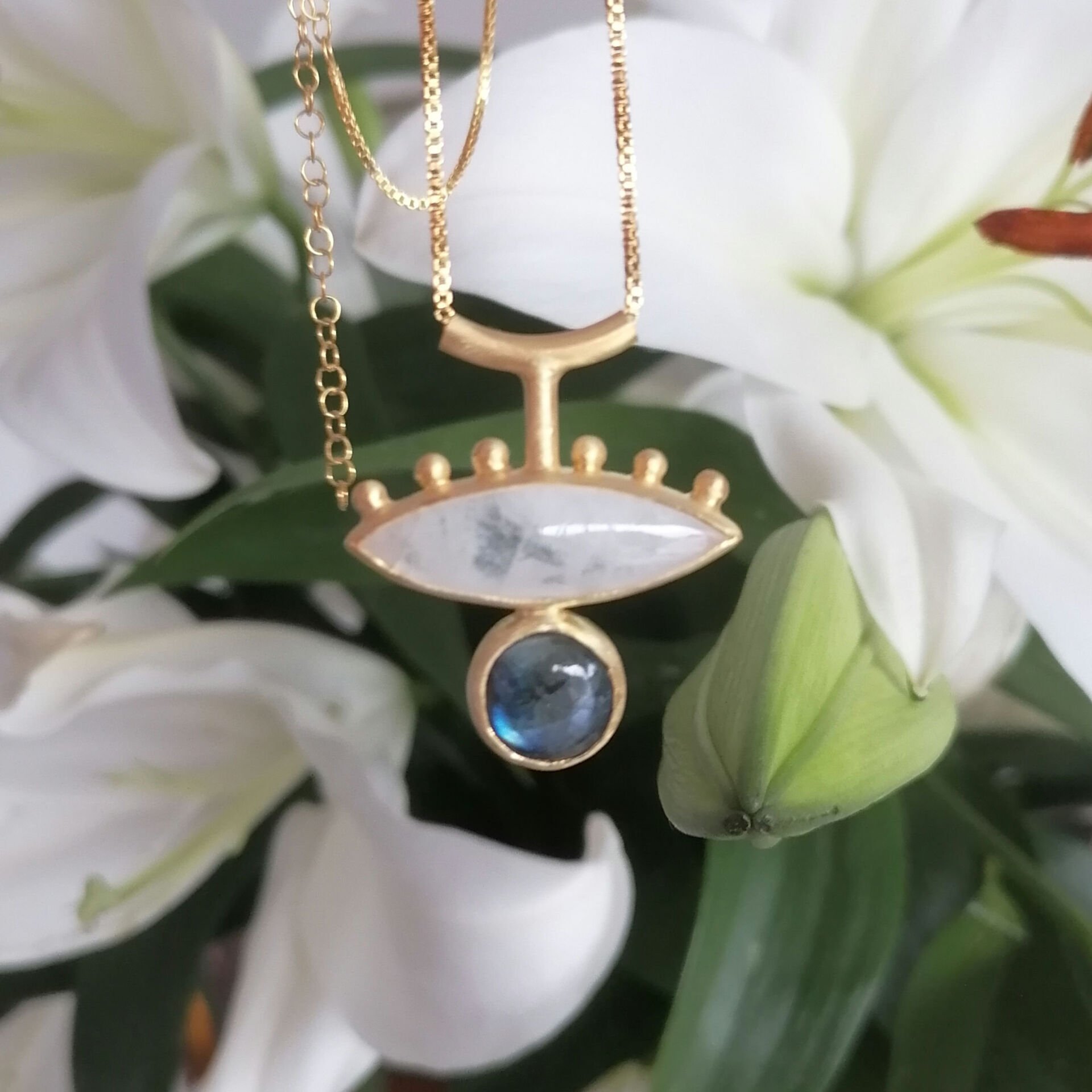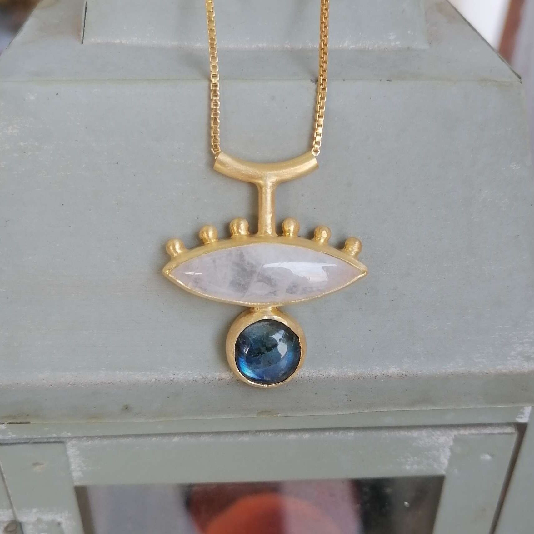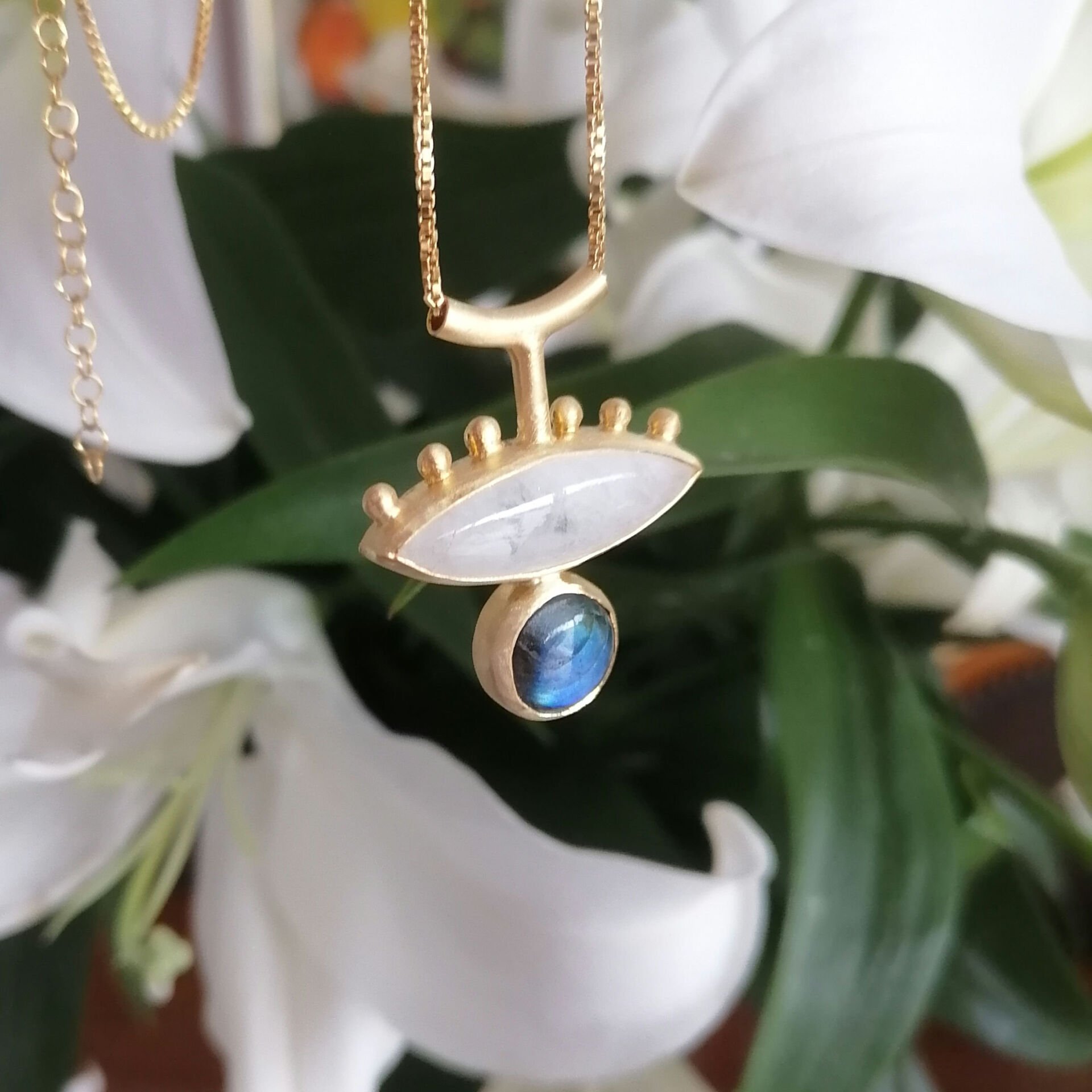 *Labradorite ve Ay Taşlı Benekli Kolye II, 925 ayar gümüş üzeri altın kaplamadır.