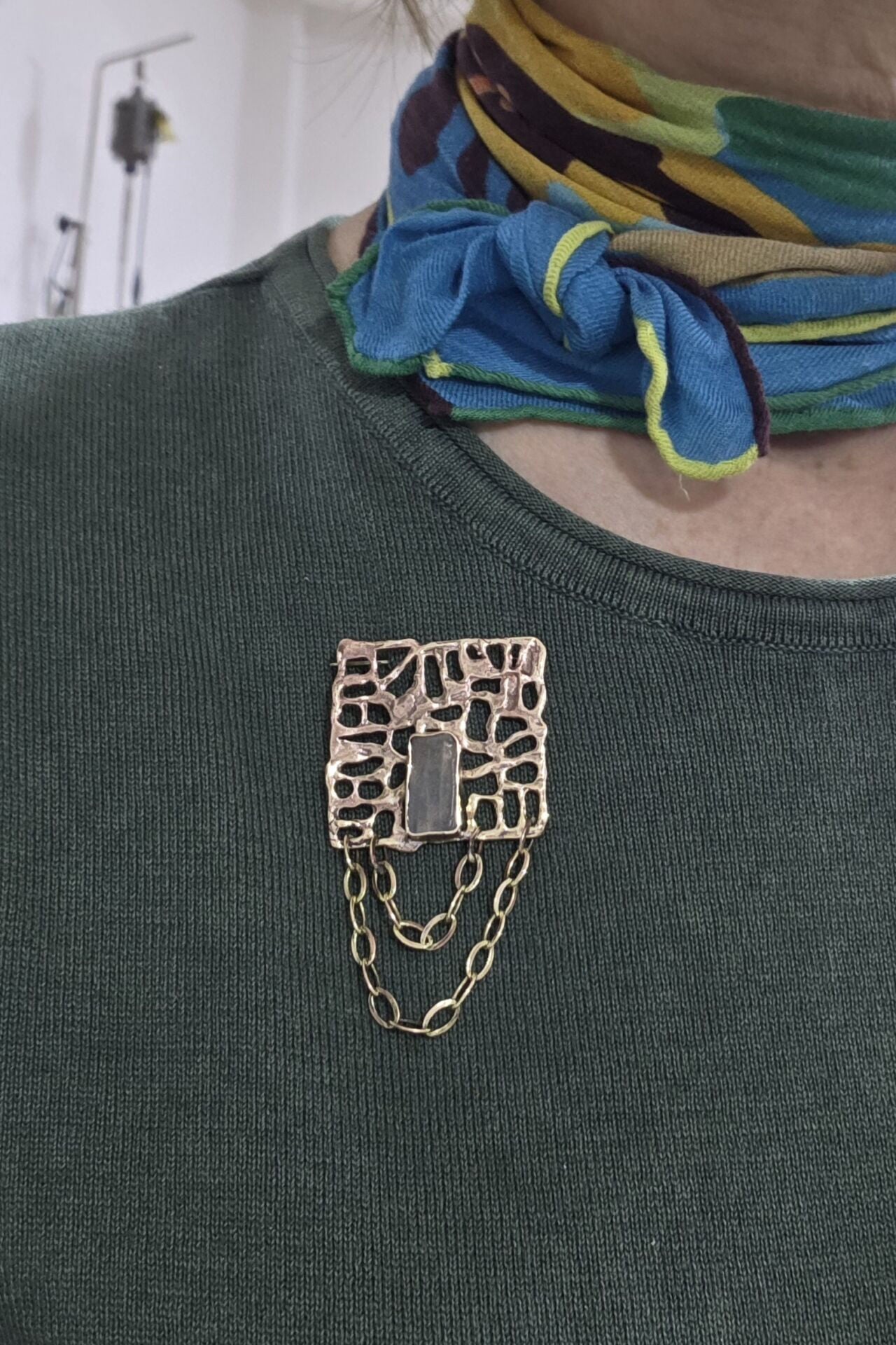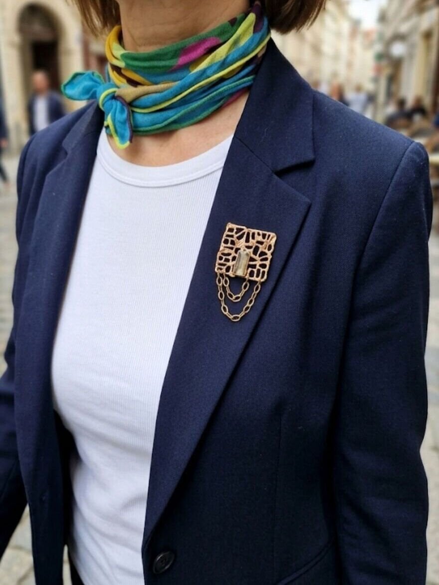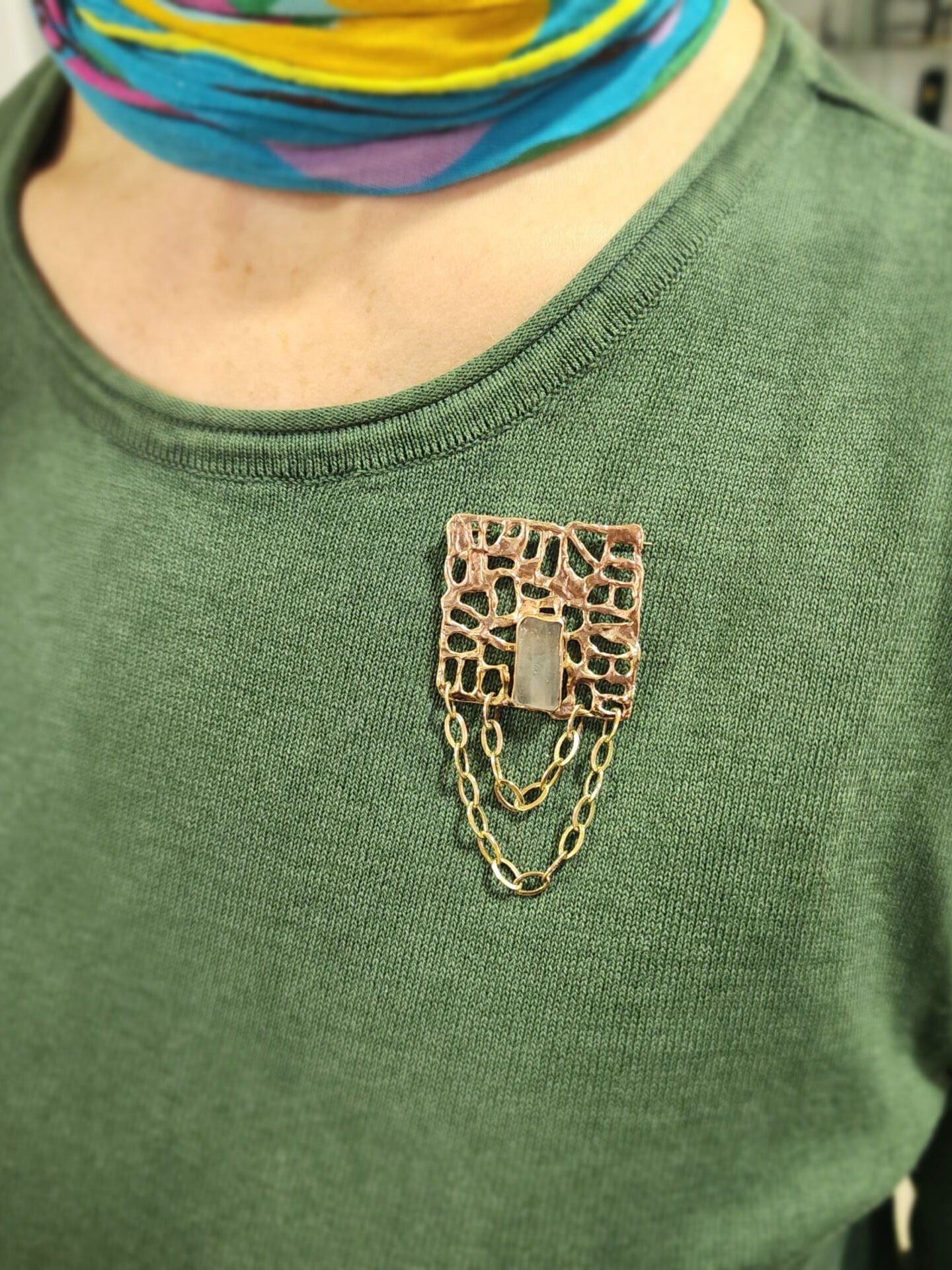 Kapalı Çarşı’nın geleneksel metal işleme teknikleriyle elde üretilen bu deniz camı zincirli broş, taşınabilir bir sanat eseridir. Bronz ve denizden gelen bir yadigarla üretilen broş, hem modern hem de klasik kombinlerinizin imzası olacak. Atölyemizde sınırlı sayıda üretilen bu özel broş ile doğanın ve zanaatın gücünü üzerinizde taşıyın."